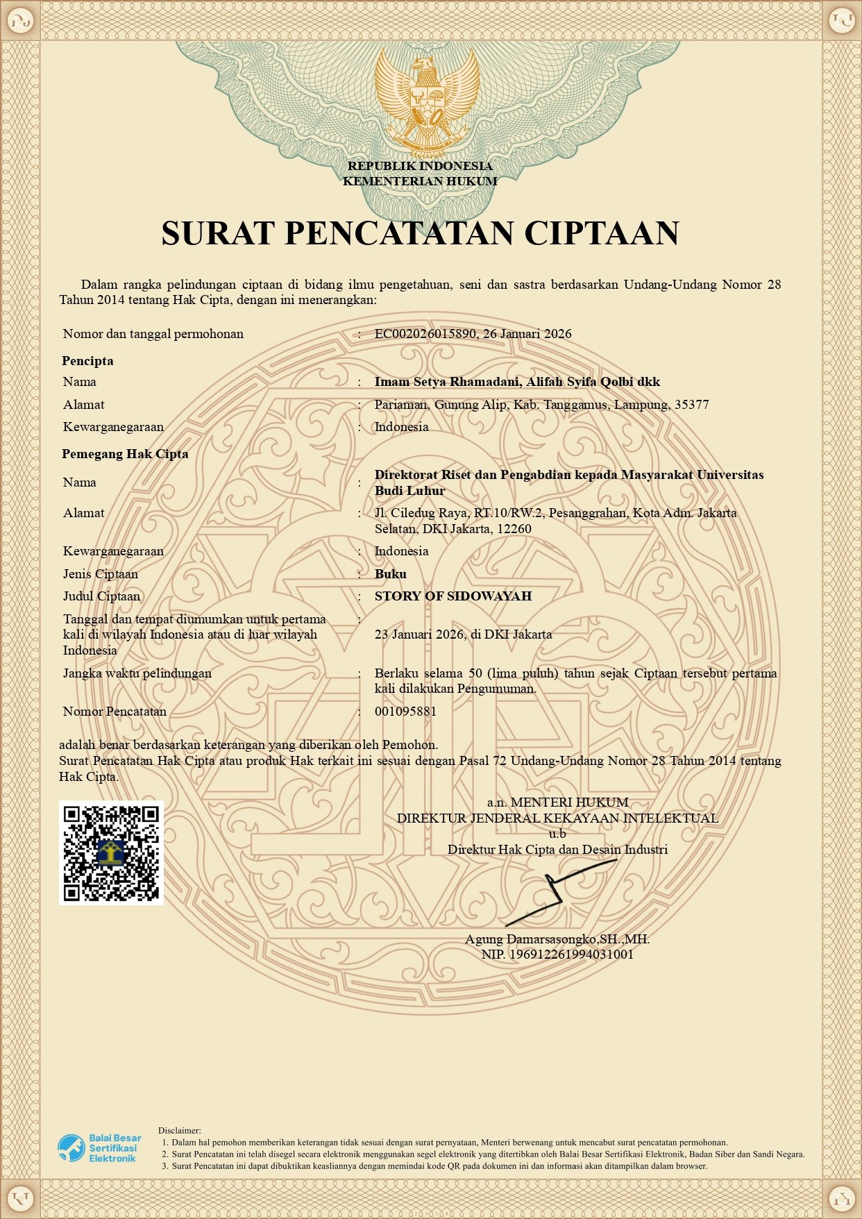 Sebagai bentuk perlindungan hukum atas karya intelektual ini, buku Story Of Sidowayah telah resmi terdaftar dan memperoleh Surat Pencatatan Ciptaan dari Kementerian Hukum Republik Indonesia.