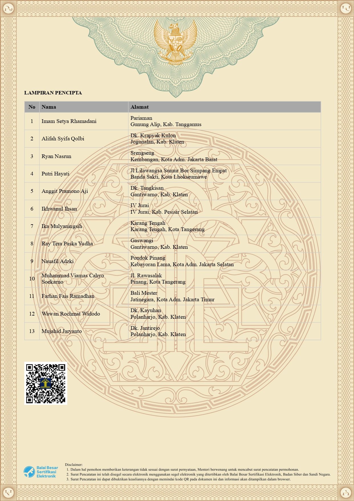 1. Imam Setya Rhamadani 2. Alifah Syifa Qolbi 3. Ryan Nasrun 4. Putri Hayati, S.ST., M.Kom. 5. Ray Tera Paska Yudha 6. Anggit Pramono Aji 7. Ikhwanul Ihsan 8. Ika Mulyaningsih 9.Nauafil Adzki 10.Muhammad Viamas Cahyo Soekarno 11. Farhan Fais Ramadhan